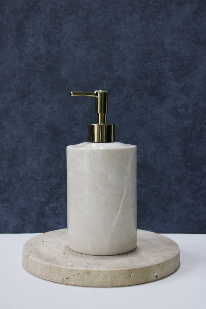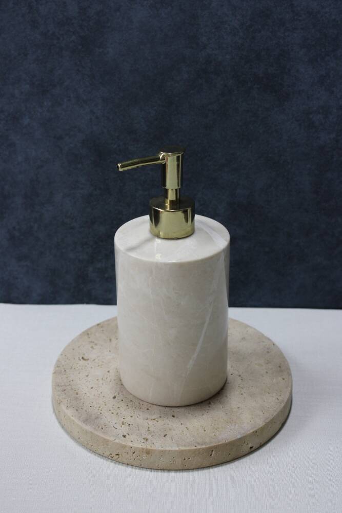 Bej mermer sıvı sabunluk bir adet silindir mermer kutu ve bir adet pompa içermektedir.