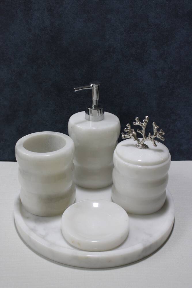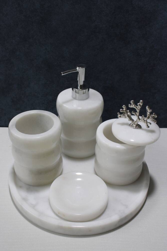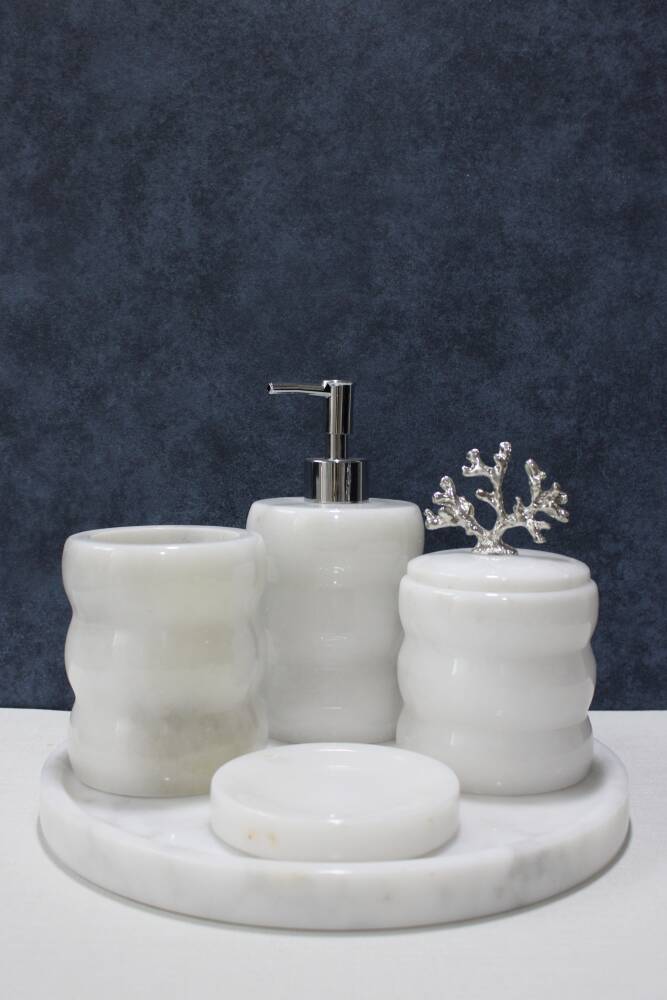 Beyaz mermer 5'li banyo seti birer adet sıvı sabunluk, katı sabunluk, diş fırçalık, pamukluk ve tepsi içermektedir.
