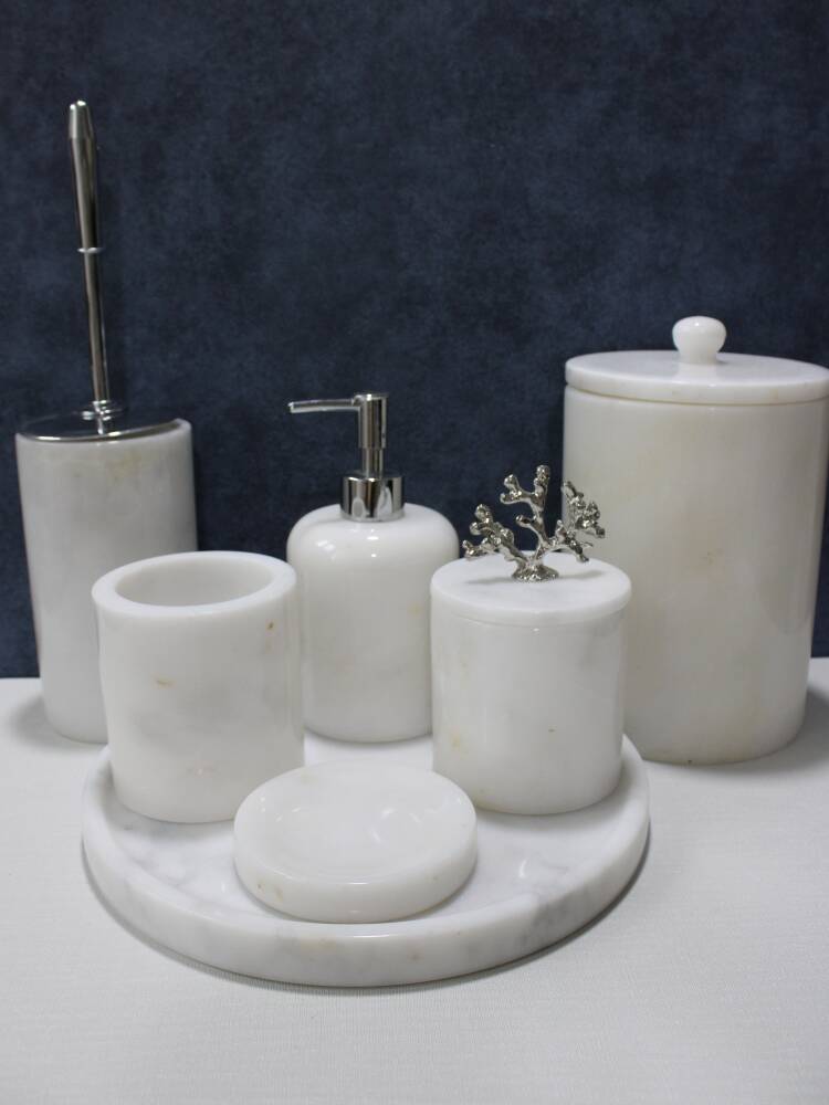 Beyaz mermer 7'li banyo seti birer adet sıvı sabunluk, katı sabunluk, diş fırçalık, pamukluk, çöp kovası, klozet fırçalığı ve tepsi içermektedir.