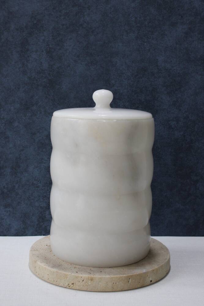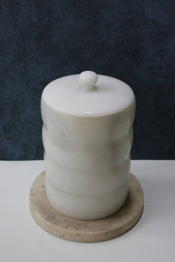 Beyaz mermer çöp kovası bir adet silindir mermer kutu ve bir adet kapak içermektedir.