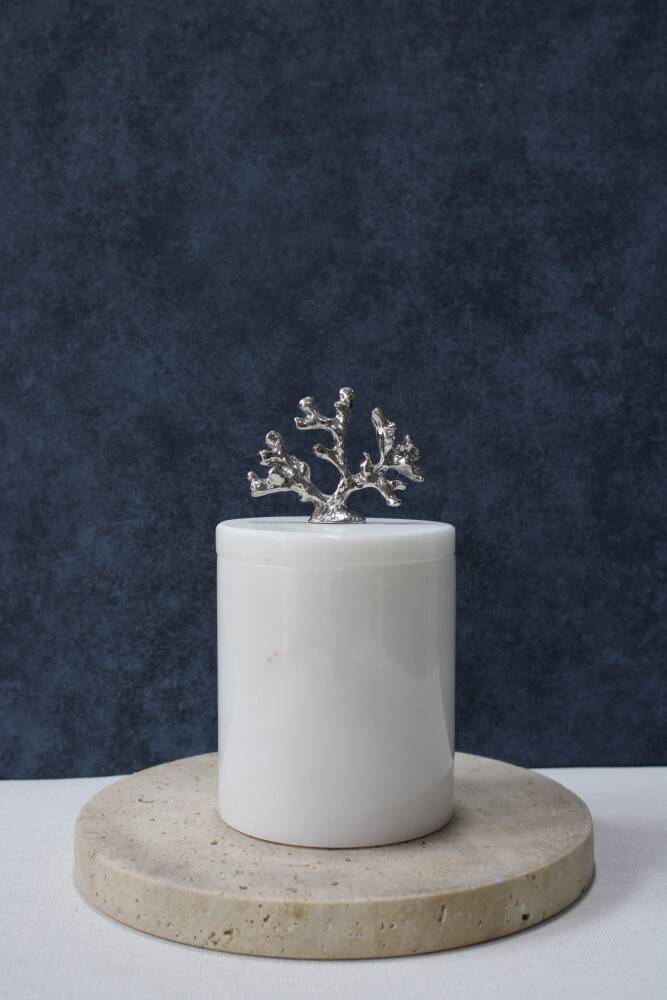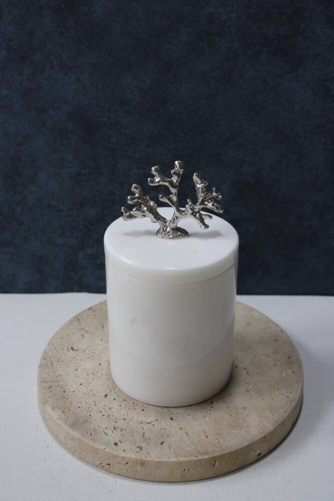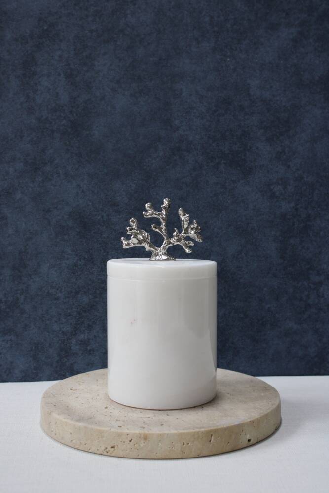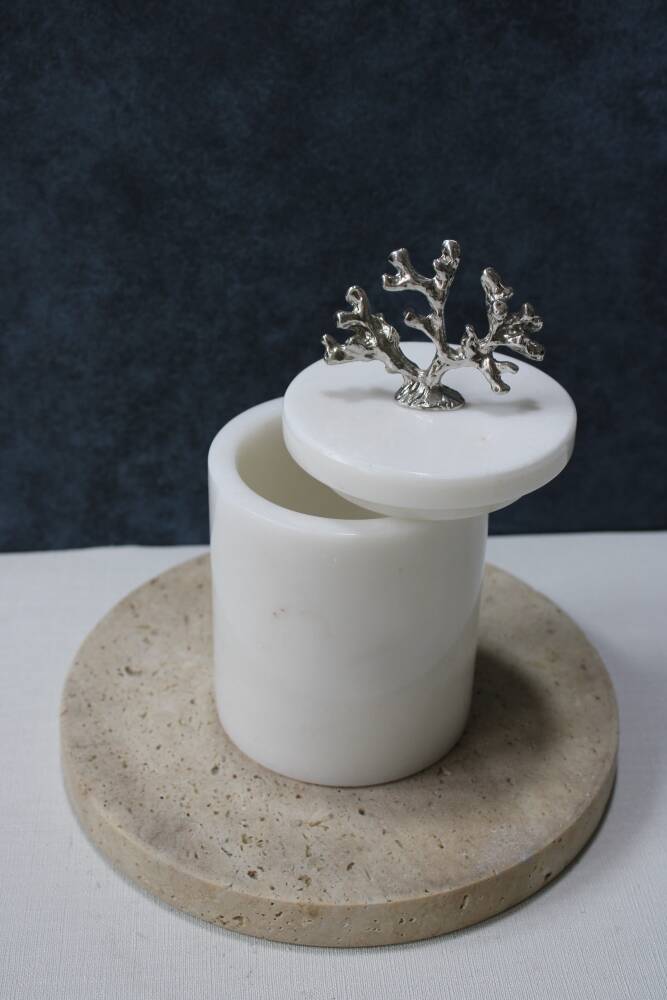 Beyaz mermer pamuk kutusu/pamukluk bir adet silindir mermer kutu ve bir adet kulplu kapak içermektedir.