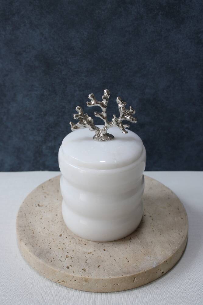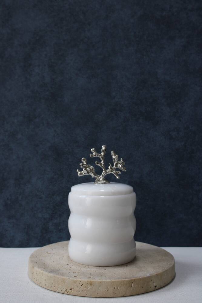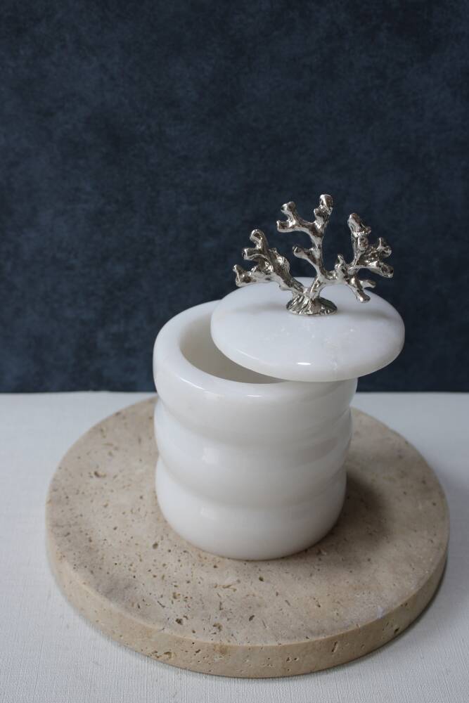 Beyaz mermer pamuk kutusu/pamukluk bir adet silindir mermer kutu ve bir adet kulplu kapak içermektedir.