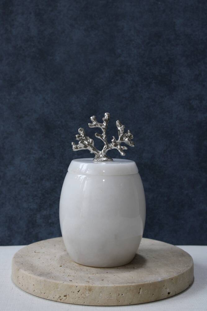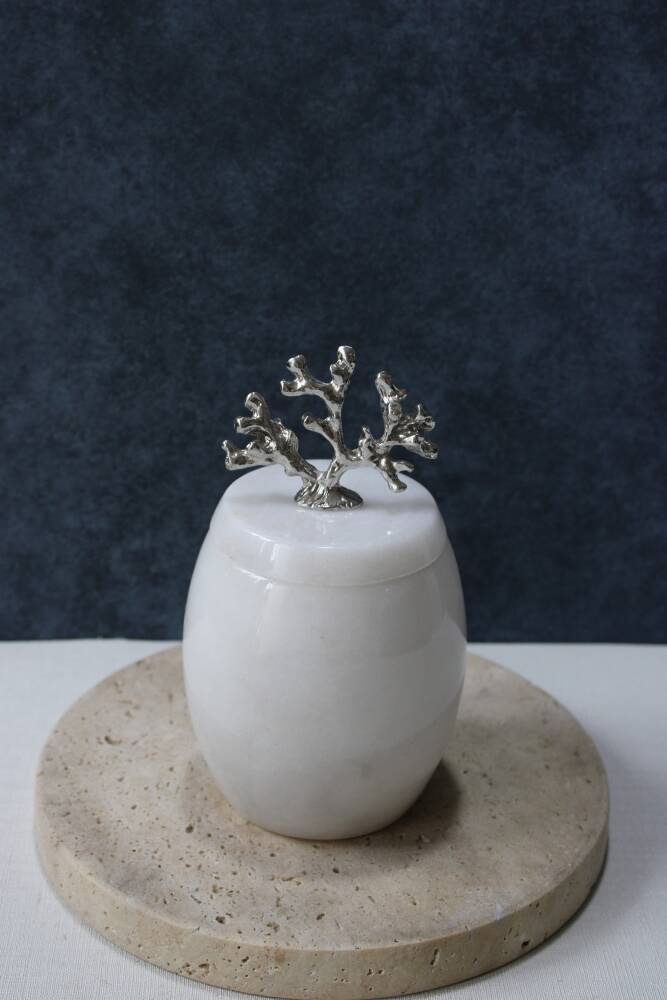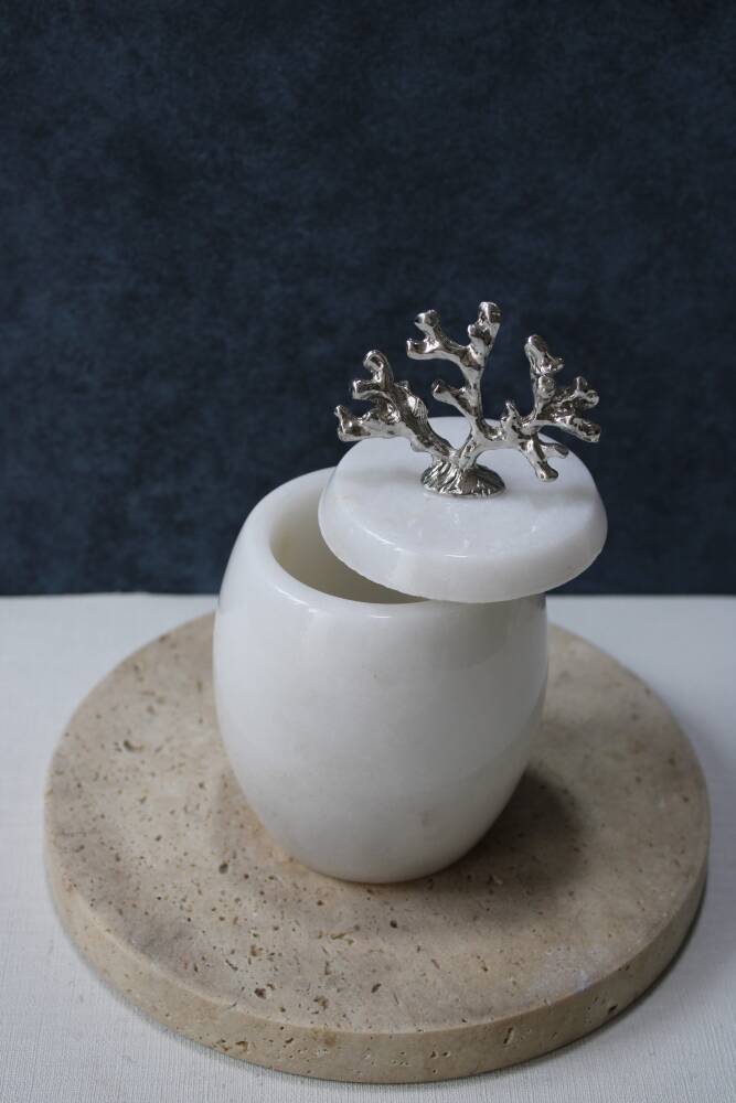 Beyaz mermer pamuk kutusu/pamukluk bir adet silindir mermer kutu ve bir adet kulplu kapak içermektedir.