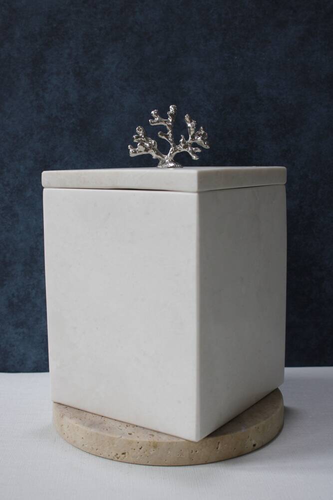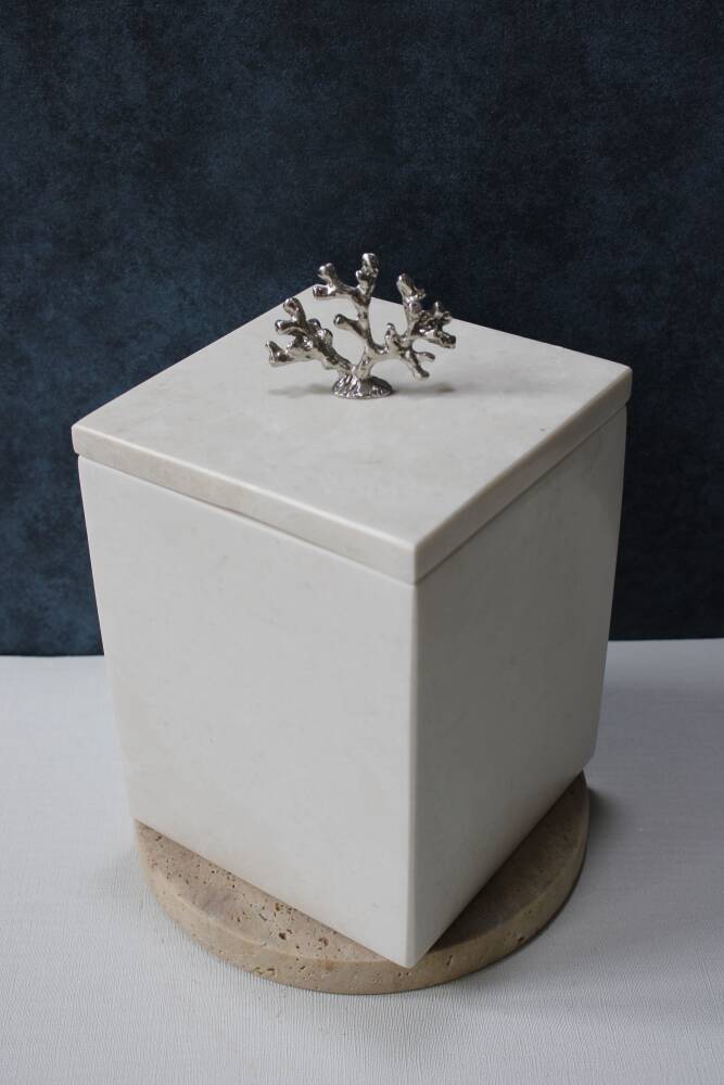 Beyaz mermer çöp kovası bir adet silindir mermer kutu ve bir adet kapak içermektedir.