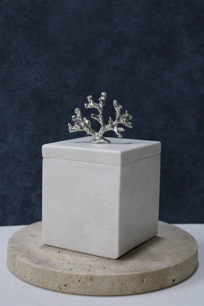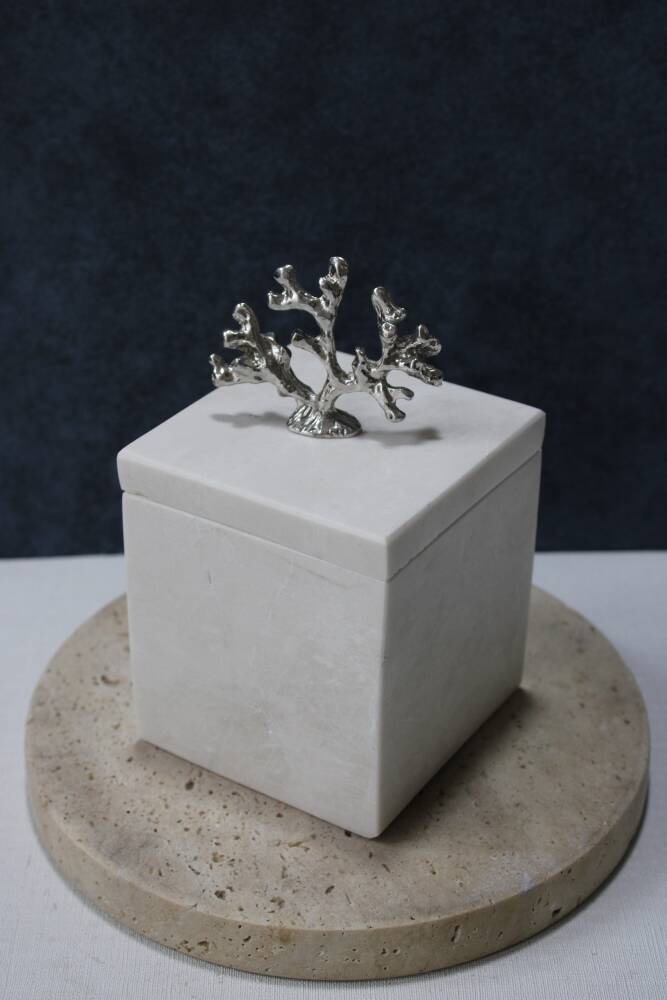 Kare bej mermer pamuk kutusu/pamukluk bir adet kare mermer kutu ve bir adet kulplu kare kapak içermektedir.