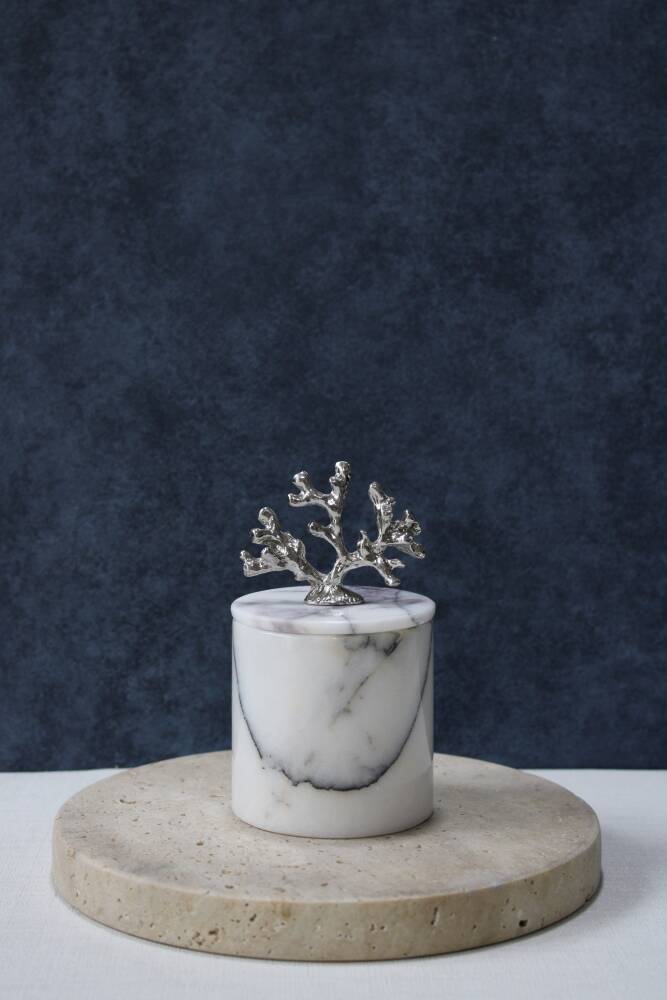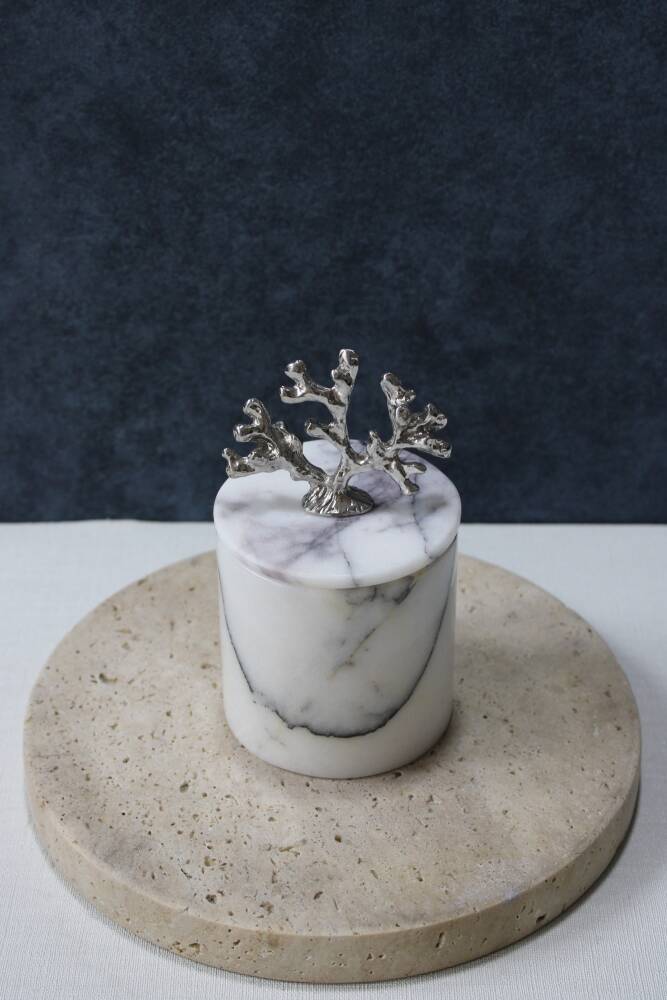 Leylak mermer pamuk kutusu/pamukluk bir adet silindir mermer kutu ve bir adet kulplu kapak içermektedir.